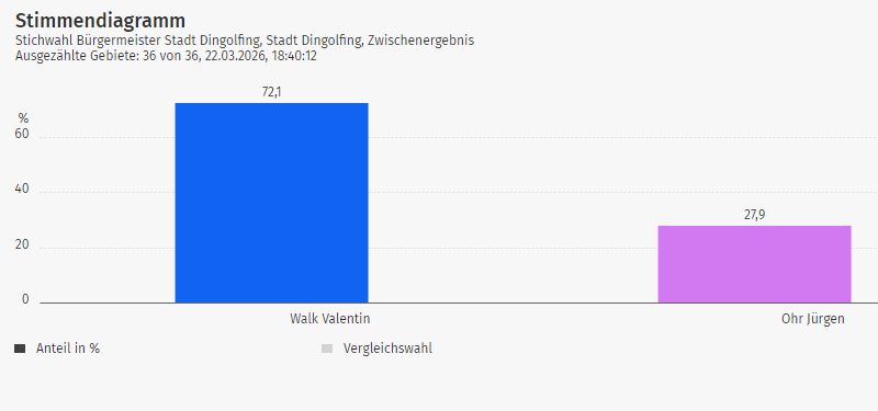Valentin Walk ist neuer Erster Bürgermeister der Stadt Dingolfing. Der 29-jährige CSU-Kandidat setzte sich in der Stichwahl mit 71,1 Prozent der Stimmen gegen seinen Mitbewerber Jürgen Ohr (Bürger für Bürger) durch. Die Wahlbeteiligung lag bei 41,6 Prozent. Walk tritt sein Amt mit sofortiger Wirkung an.