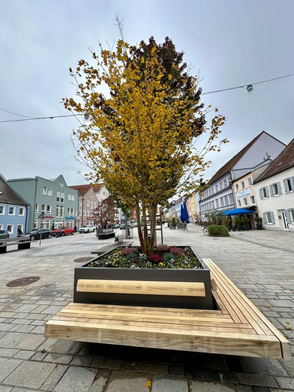 Sechs weitere Einheiten wurden auf dem Marienplatz installiert. Darunter befinden sich auch drei Bauminseln mit jeweils drei Sitzbänken. Die großen Pflanztröge mit den Sträuchern und kleinen Bäume sollen am zentralen Platz Dingolfings die Atmosphäre aufwerten und die Aufenthaltsqualität nachhaltig verbessern.